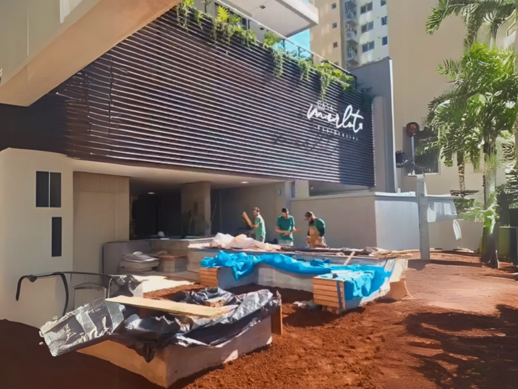 Planejamos a área completa da sua obra. Passeios, escadas, área de lazer, piscinas, decks, varandas, painéis verdes e pergolados. Com as plantas até os móveis de decoração e iluminação.